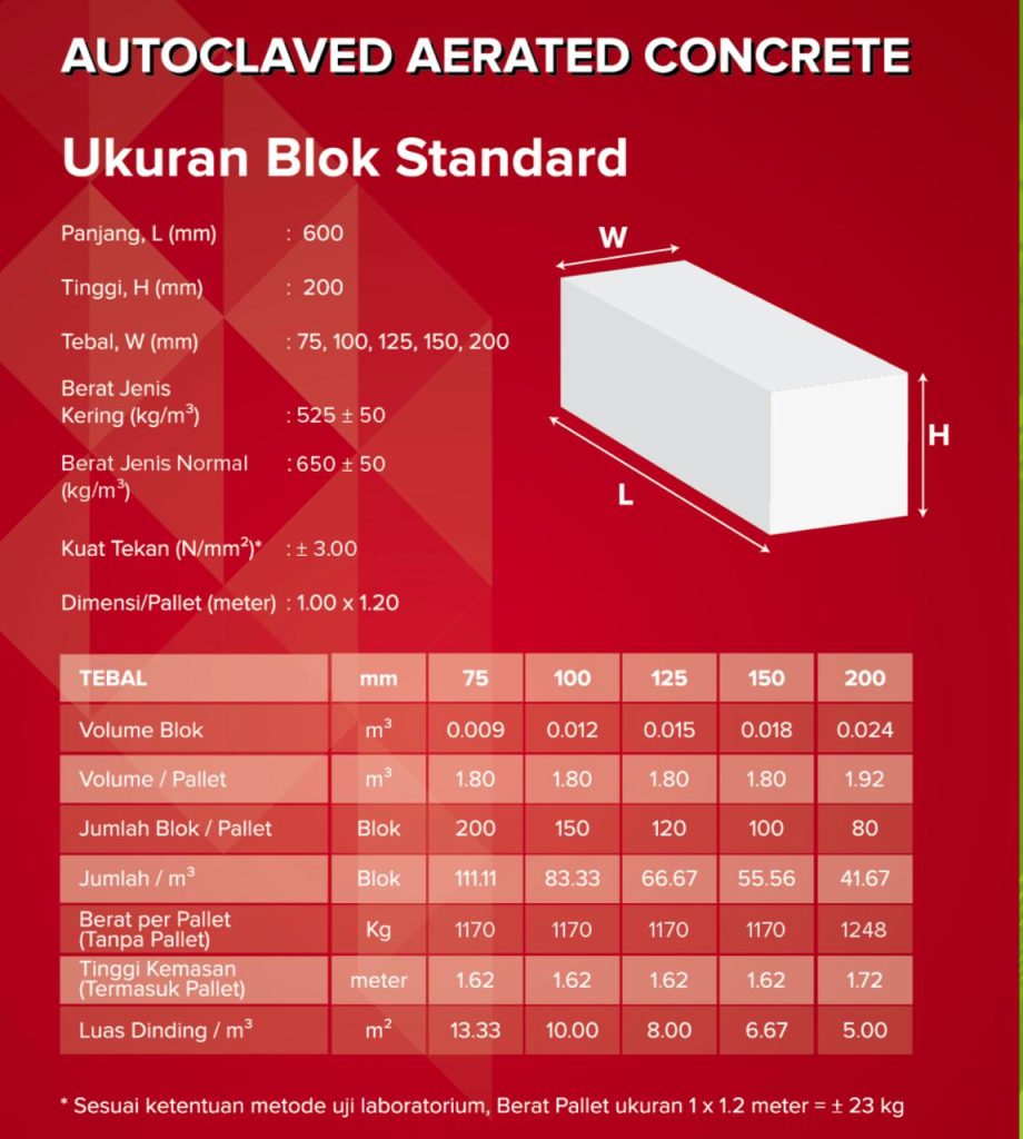 Dengan berat jenis kering sekitar 490 kg/m³ dan kuat tekan hingga 4,0 N/mm², bata ringan ini menawarkan keseimbangan sempurna antara kekuatan dan bobot yang ringan. Setiap blok berukuran 600 x 200 mm dengan variasi ketebalan mulai dari 75 mm hingga 200 mm, menjadikannya fleksibel untuk berbagai kebutuhan dinding bangunan.