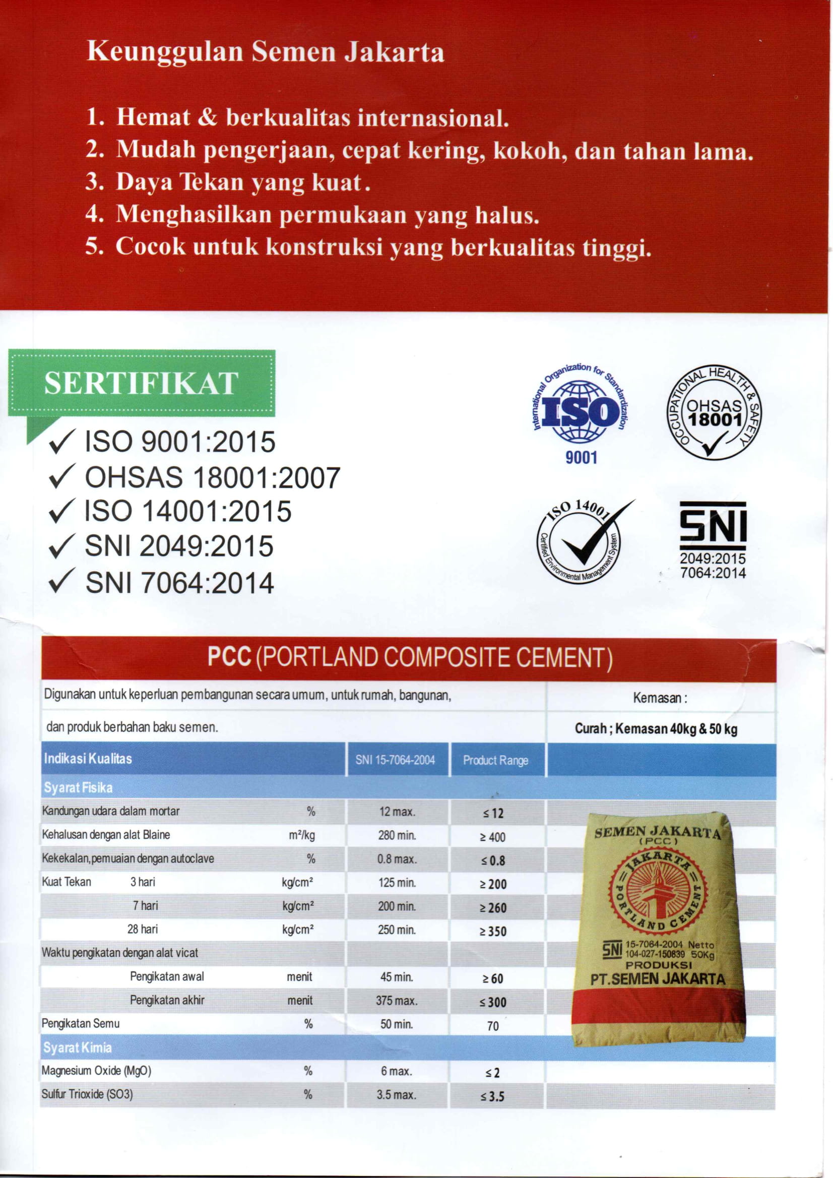 Dengan sertifikasi ISO 9001:2015, ISO 14001:2015, OHSAS 18001:2007, serta SNI 2049:2015 dan 7064:2014, Semen Jakarta terbukti memiliki daya tekan tinggi, mudah dikerjakan, cepat kering, dan memberikan hasil yang kokoh serta estetis.
